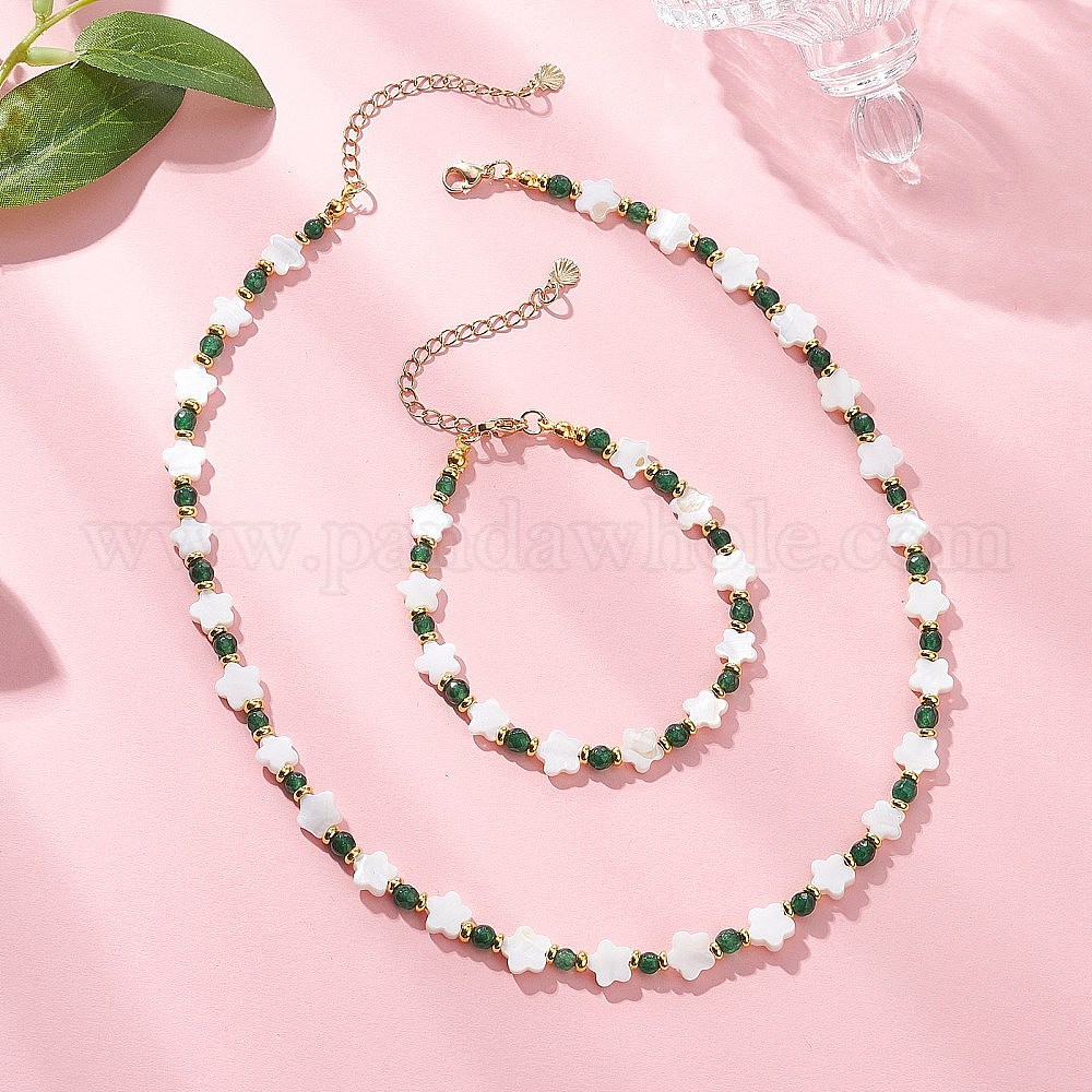 • Золотой Комплекты браслетов и ожерелий из натуральных пресноводных ракушек и круглого окрашенного натурального белого нефрита, золотые, колье: 17.24 дюйм (43.8 см)