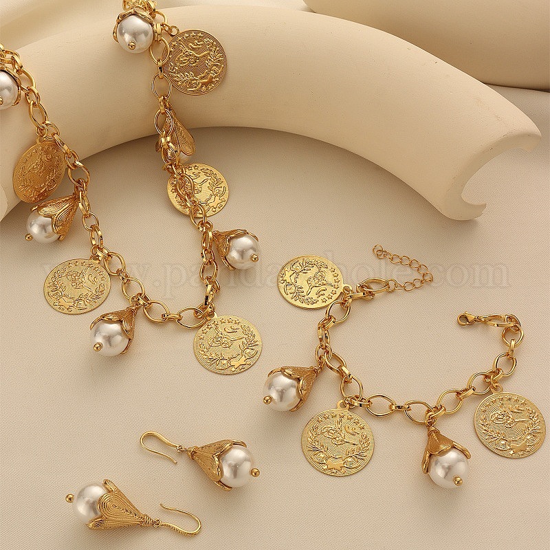 Ожерелья, серьги и браслеты с подвесками из искусственного жемчуга из сплава и пластика, цветок и плоский круг