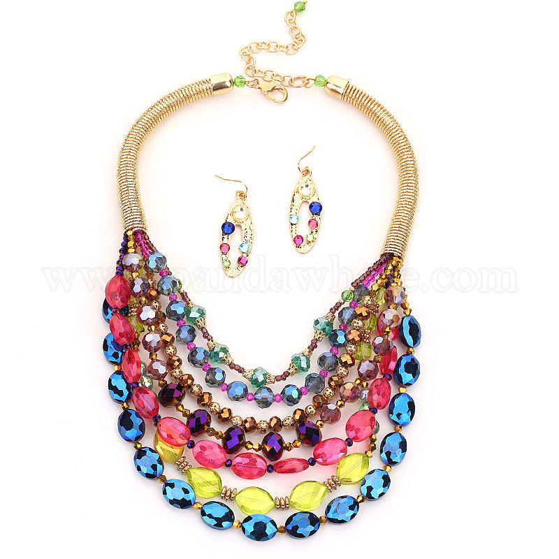 Наборы многослойных ожерелий и висячих сережек из сплавов, акрила и стекла, овальные, золотые