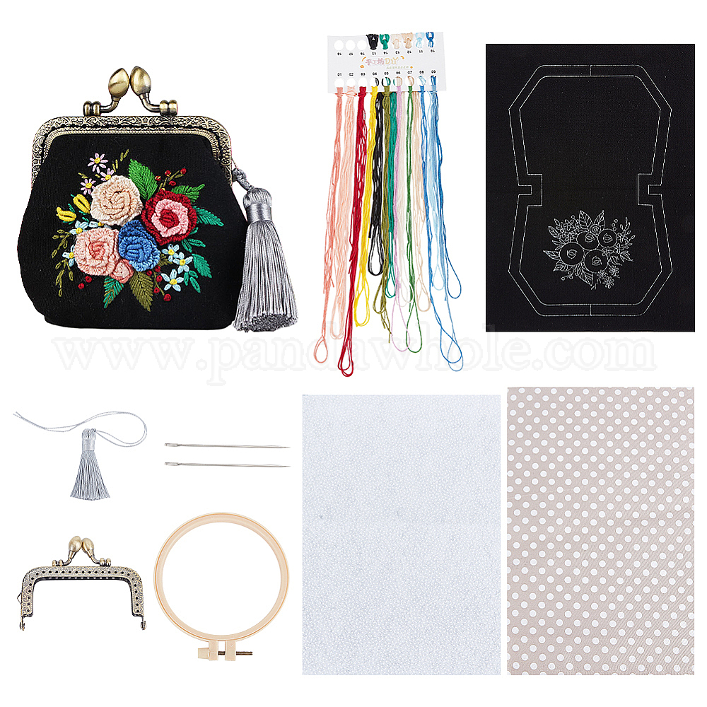 Кошелек для сменных цветочных узоров своими руками 3d набор для вышивания, включая ручку замка поцелуя из сплава, пластиковые пяльцы для вышивания, нить, железная игла, полиэфирная ткань, кистями, Технические характеристики