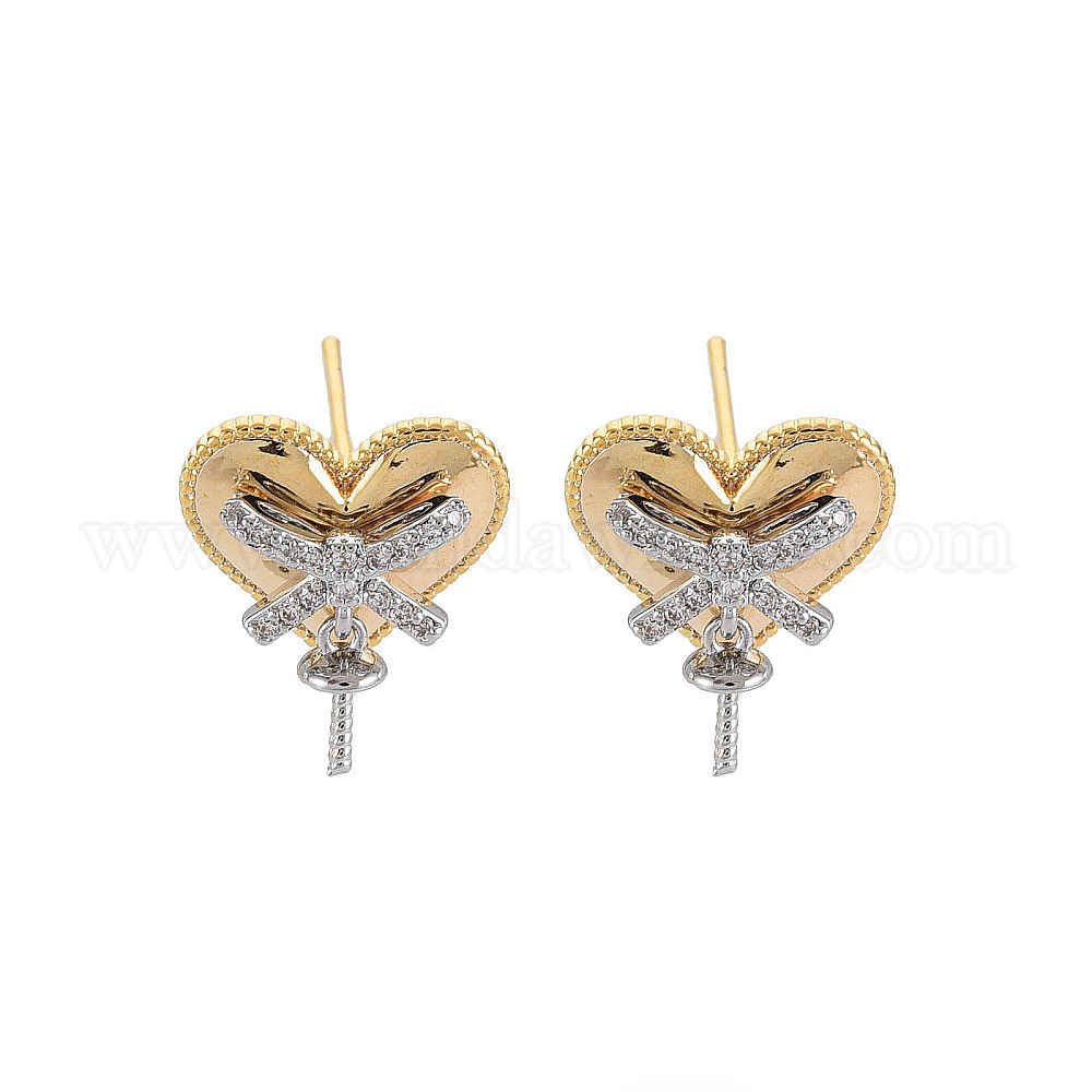 Латунные микро-паве прозрачные серьги-гвоздики из циркония, за половину пробурено бисера, без никеля , сердце с бантом