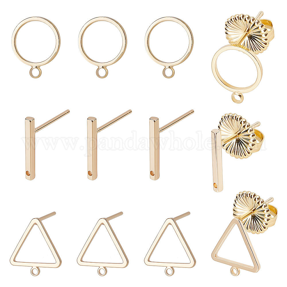 • Настоящее золото 18K 12шт 3 стиль латунные серьги-гвоздики фурнитура с петлей, с ушными гайками 12 шт., прямоугольник и кольцо и треугольник, реальный 18 k позолоченный, 12.5x1.5~12 мм, отверстие : 0.8~1.4 мм, штифты : 0.7~0.8 мм, 4 шт / стиль
