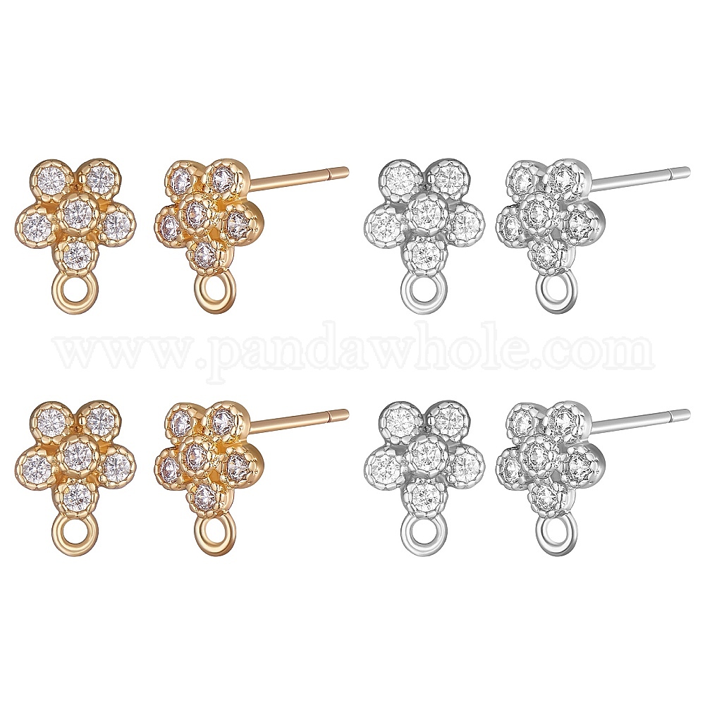 фурнитура для серег-гвоздиков из латуни с кубическим цирконием в виде цветка: длина около 8 мм, шириной 6.5 мм , отверстие : 1 мм, штифты : 0.7 мм, 2 цветов, 2 пары / цвет, 4 пары;