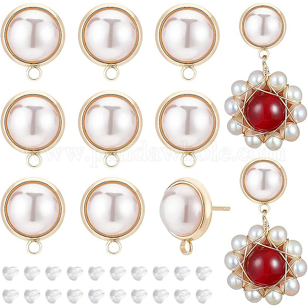 • Настоящее золото 18K 12шт. латунные купольные/полукруглые серьги-гвоздики, с горизонтальными петлями и бусинами из абс-пластика, имитирующими жемчуг, 30 гайки ушные пластиковые, без никеля , реальный 18 k позолоченный, 15.5x13 мм, отверстие : 1.8 мм, штифты : 1 мм