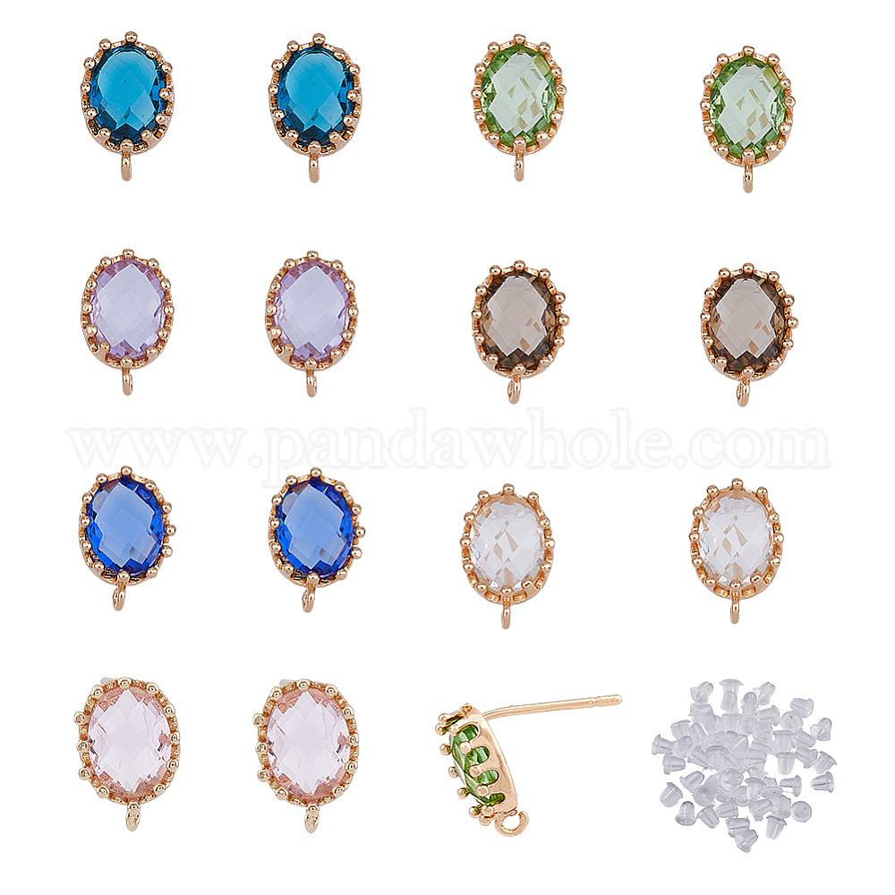 • (52) Непрозрачная лаванда 28шт. 7 цветная латунная фурнитура для сережек-гвоздиков, со стеклом и вертикальными петлями, с 50 пластиковыми ушными гайками, овальные, золотой свет, долговечный, разноцветные, 11.5x7.5 мм, отверстие : 1 мм, штифты : 0.7 мм, 4 шт / цвет