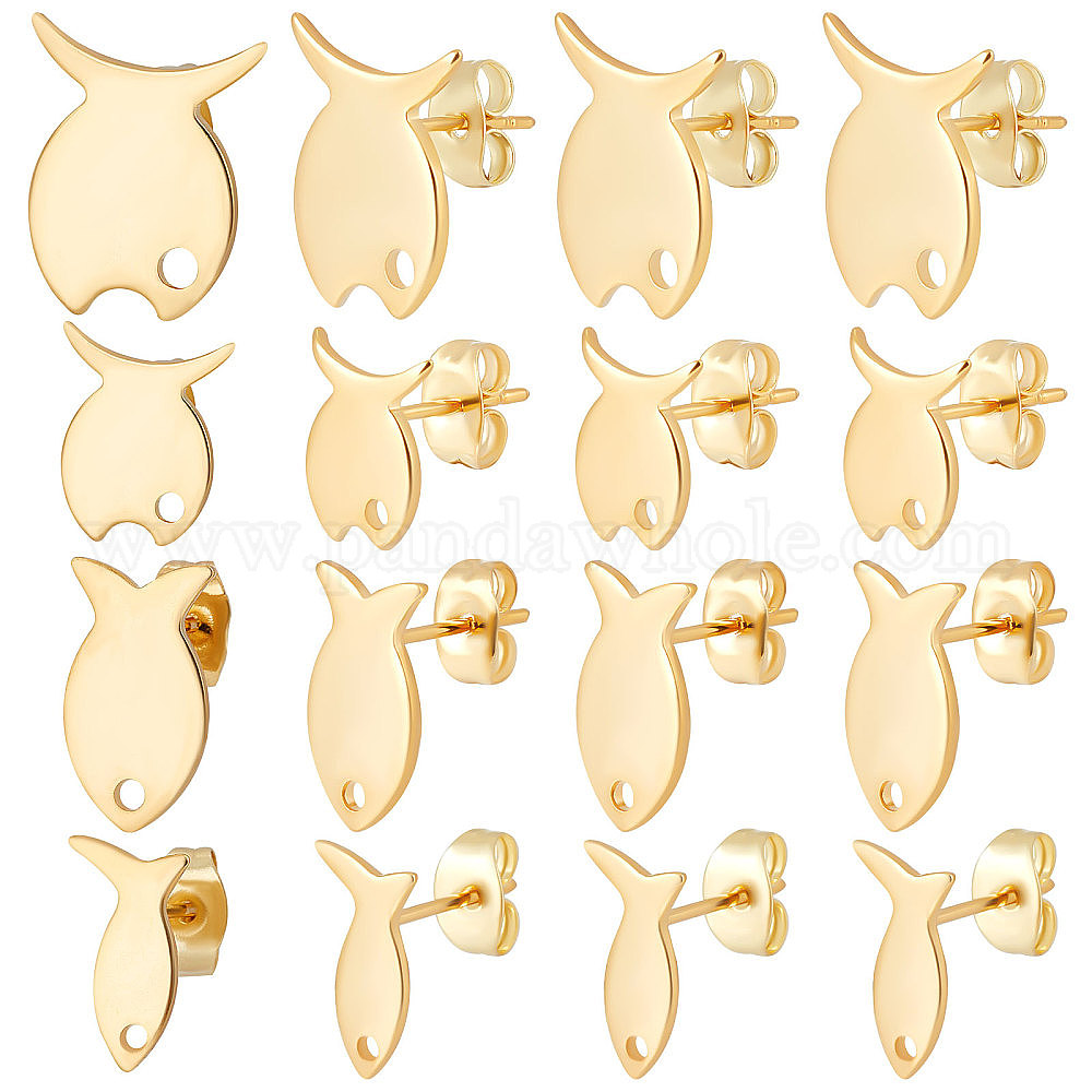 • Настоящее золото 24K 80 шт 4 стиль 201 серьги-гвоздики из нержавеющей стали, с отверстием и 304 штифтами из нержавеющей стали и ушными гайками, рыба, реальный 24 k позолоченный, 10.5~15x6.5~12.5 мм, отверстие : 1.2~1.8 мм, штифты : 0.8 мм, 20 шт / стиль