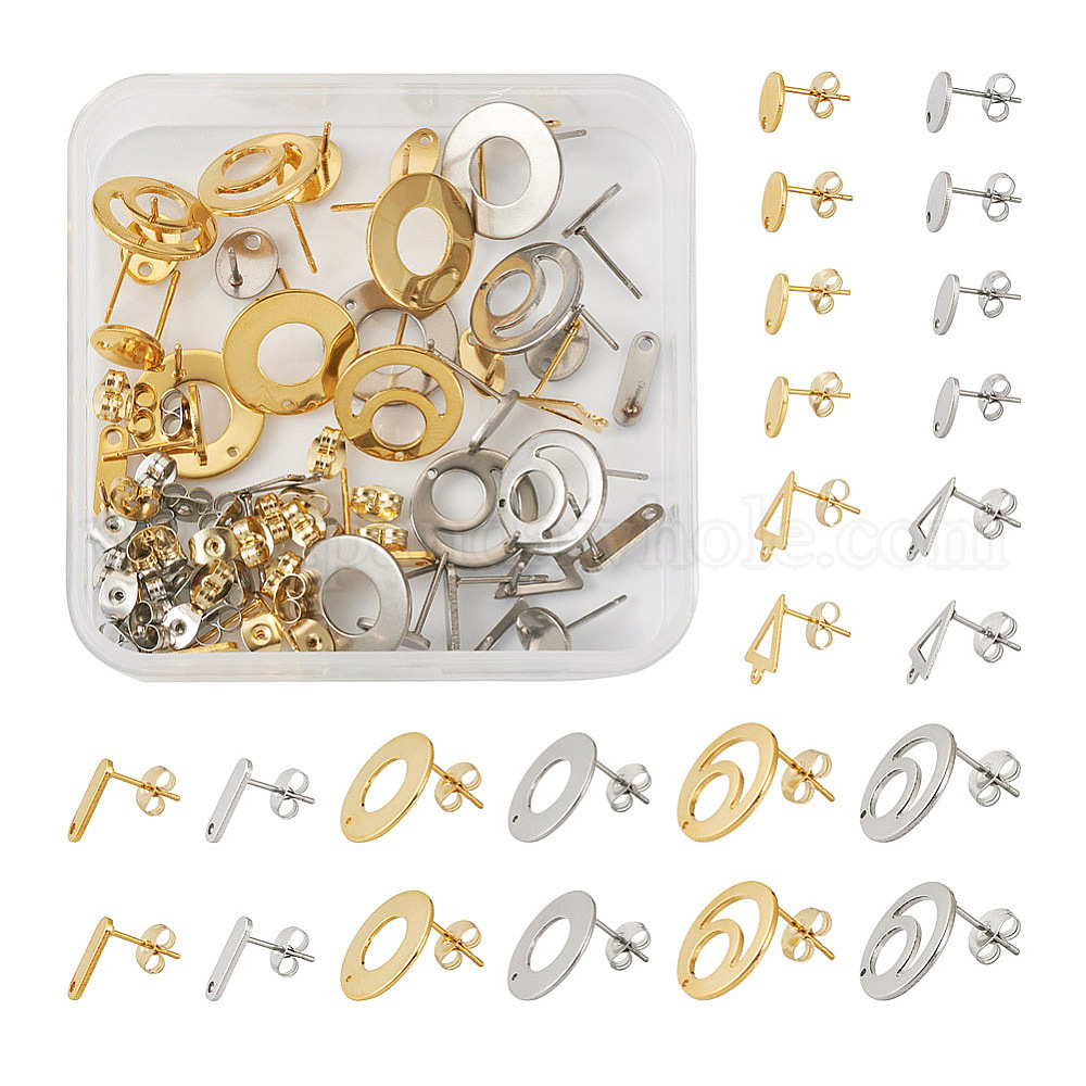 48шт 12 стили 201 фурнитура для сережек из нержавеющей стали, с отверстием и 304 штифтами из нержавеющей стали и ушными гайками, прямоугольный и овальный и плоский круглый и пончик и треугольник