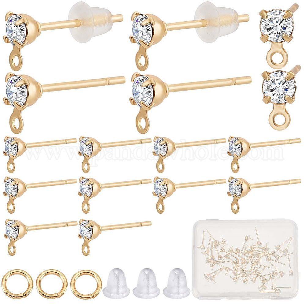 60 шт. латунные серьги-гвоздики, с прозрачным кубическим цирконием и горизонтальными петлями, с 60открытыми соединительными кольцами и 100пластиковыми ушными гайками (02FNX1)