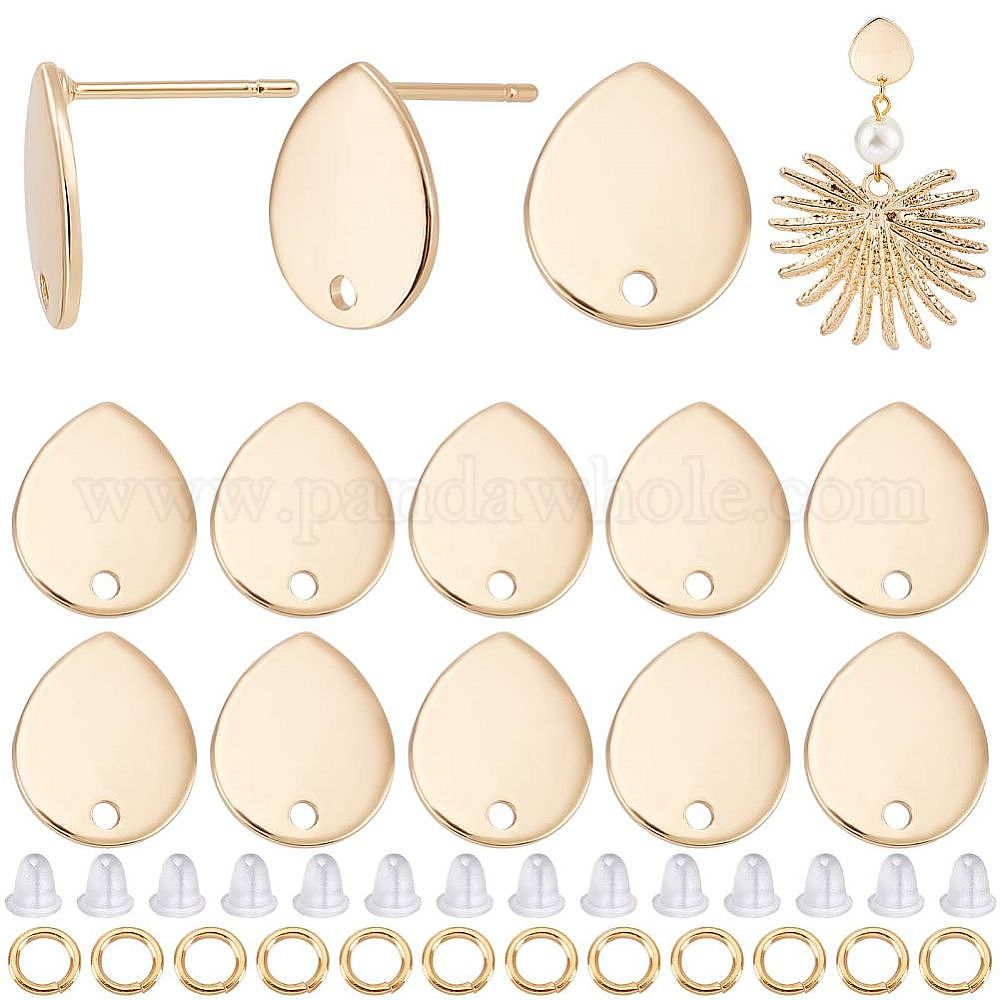 • Настоящее золото 18K 20 шт. латунные серьги-гвоздики, с отверстиями, слеза, без никеля , с соединительными кольцами 20шт. и пластиковыми ушными гайками 50шт., реальный 18 k позолоченный, 12x10 мм, отверстие : 1.4 мм, штифты : 1 мм