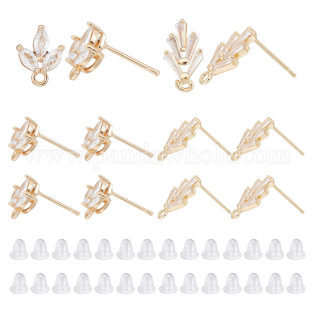 • Золотой 12шт. 2 стиль латунные микропаве прозрачные кубические цирконии лист серьги гвоздики фурнитура, с горизонтальными петлями и пластиковыми гайками 50шт., золотые, 10~15x7.5~8 мм, отверстие : 1.2~1.6 мм, штифты : 0.7~0.8 мм, 6 шт / стиль