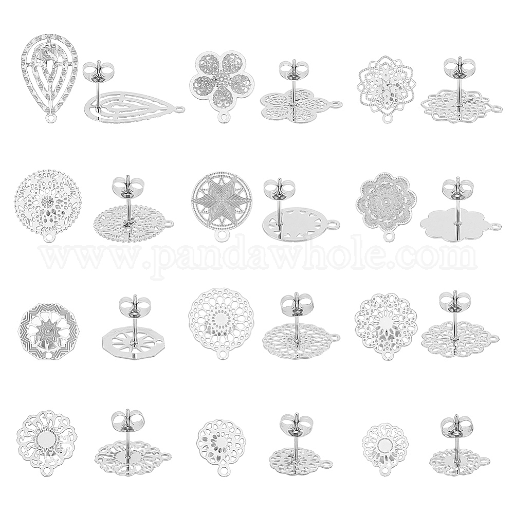 • Нержавеющая Сталь Цвет 24 шт. 12 стиль филигранный цветок и плоские круглые и каплевидные 304 фурнитура для сережек-гвоздиков из нержавеющей стали, с горизонтальными петлями, цвет нержавеющей стали, 12.5~22.5x10.5~14.5 мм, отверстие : 1 мм, штифты : 0.7 мм, 2 шт / стиль
