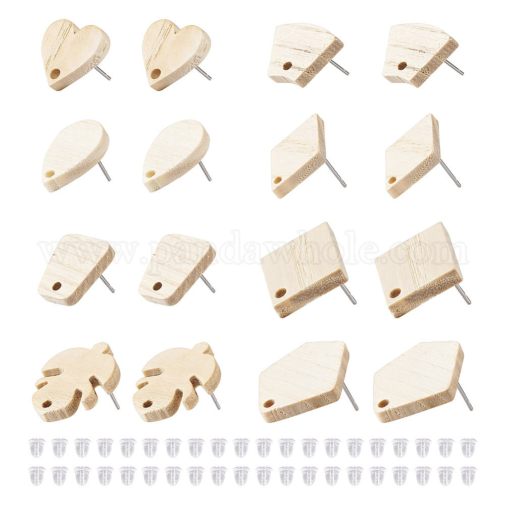 • Цвет Древесины 32шт 8 фурнитура для сережек из ясеня, с 304 штифтом из нержавеющей стали и 40 пластмассовой ушной гайкой, трапеция и ромб и капля и пятиугольник и сердце, деревесиные, 12~21.5x11~19 мм, штифты : 0.7 мм, 4 шт / стиль