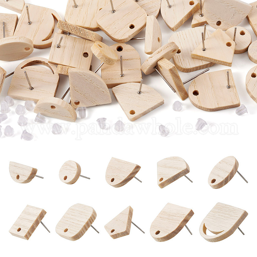 40 шт. 10 стили веерные, прямоугольные, плоские, круглые и овальные фурнитура для сережек-гвоздиков из ясеня, с 304 штифта из нержавеющей стали, с 50 пластиковыми ушными гайками