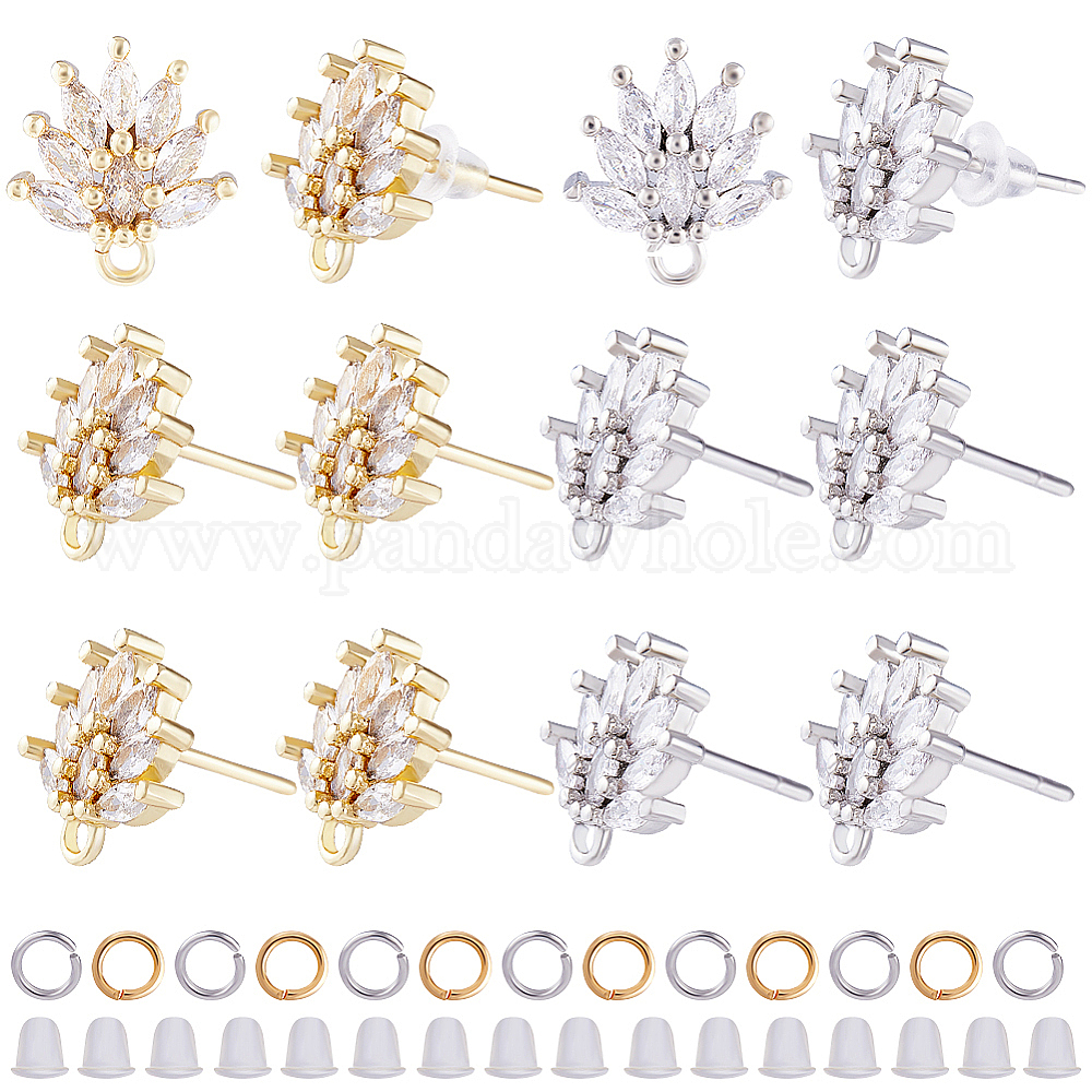 12 шт. 2 цветная латунь паве прозрачный кубический цирконий цветок серьги-гвоздики фурнитура, с горизонтальными петлями и 40 открытыми кольцами для прыжков и 50 пластиковыми ушными гайками (02JPN2)