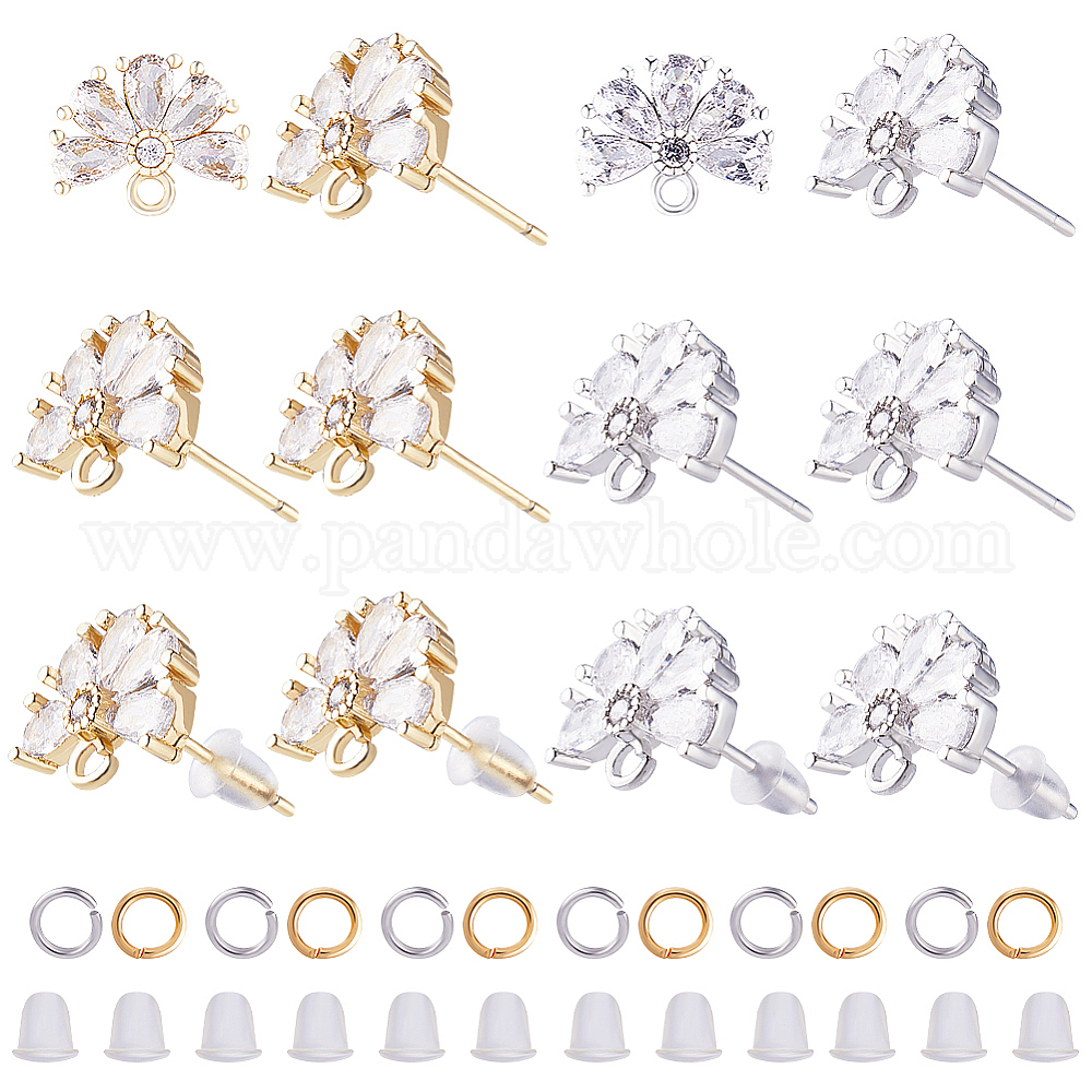 12 шт. 2 цветная латунь паве прозрачный кубический цирконий цветок серьги-гвоздики фурнитура, с горизонтальными петлями и соединительными кольцами 40шт. и пластиковыми ушными гайками 50шт.