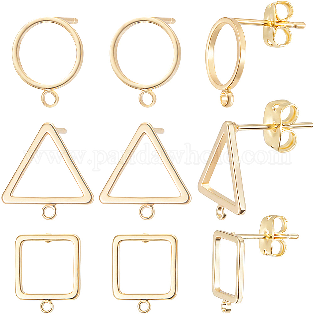 • Настоящее золото 18K 24шт. 3 фурнитура для сережек-гвоздиков из латуни в форме квадрата, треугольника и кольца, с горизонтальными петлями и фрикционными гайками 24шт., реальный 18 k позолоченный, 12~12.5x10~12x1~2 мм, отверстие : 1~1.4 мм, штифты : 0.7~0.8 мм, 8 шт / стиль