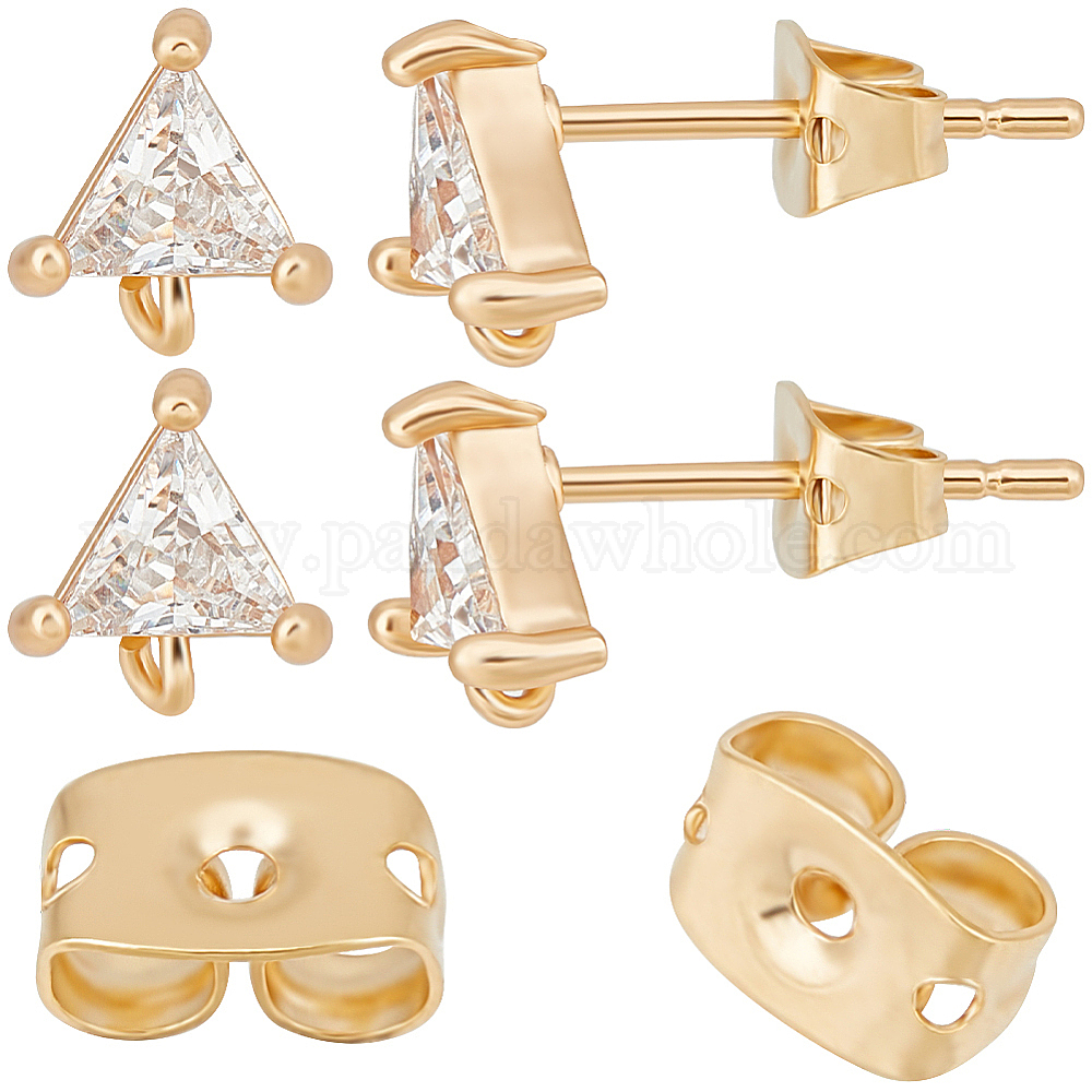 • Настоящее золото 18K 10 шт. латунные серьги-гвоздики, со стеклом и вертикальными петлями, треугольные, 10 Фрикционные ушные гайки шт., реальный 18 k позолоченный, 8x6.5 мм, отверстие : 1.2 мм