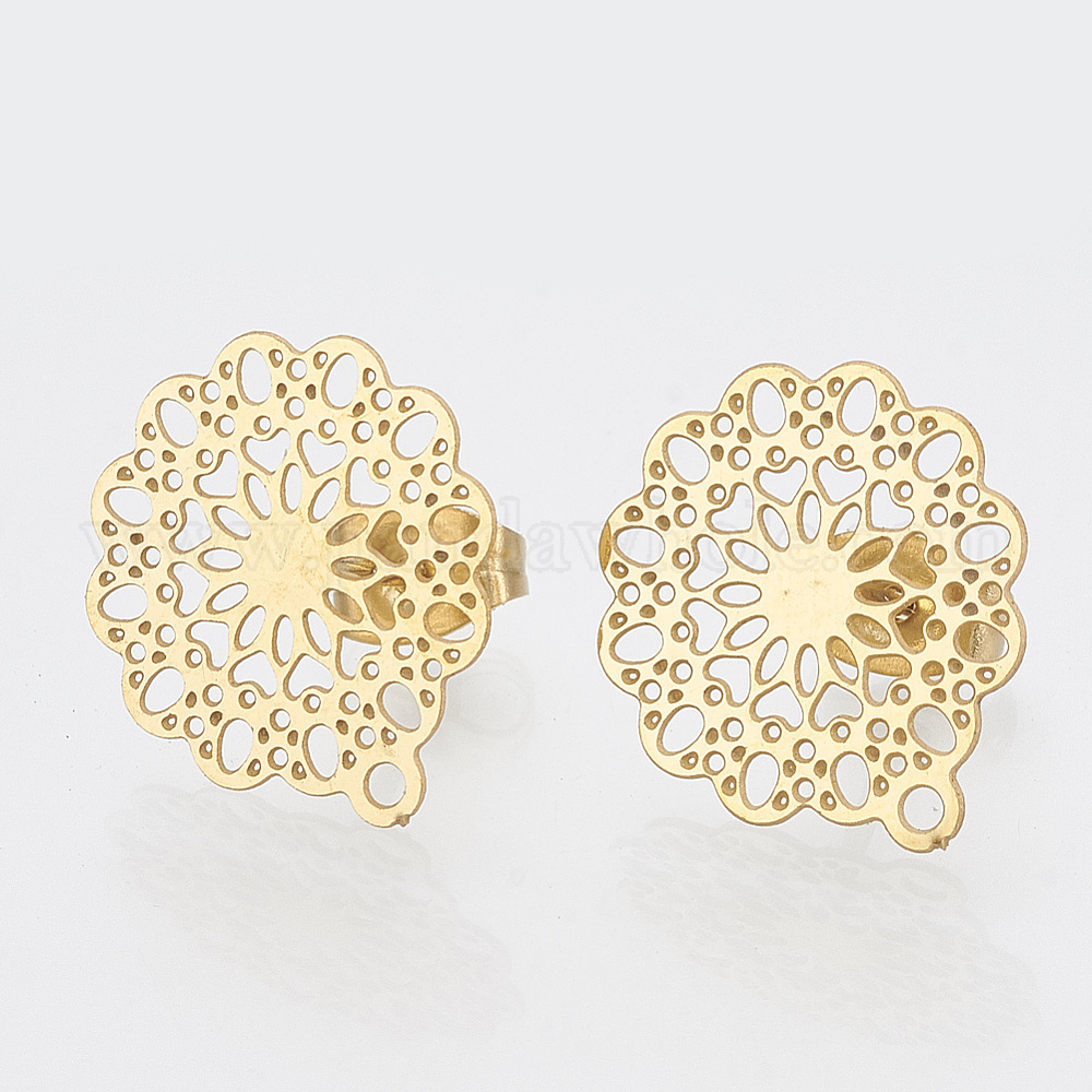 • Золотой 304 Выводы серьги из нержавеющей стали шпилька, с петлей, цветок, золотые, 16x14 мм, отверстие : 1 мм, штифты : 0.7 мм