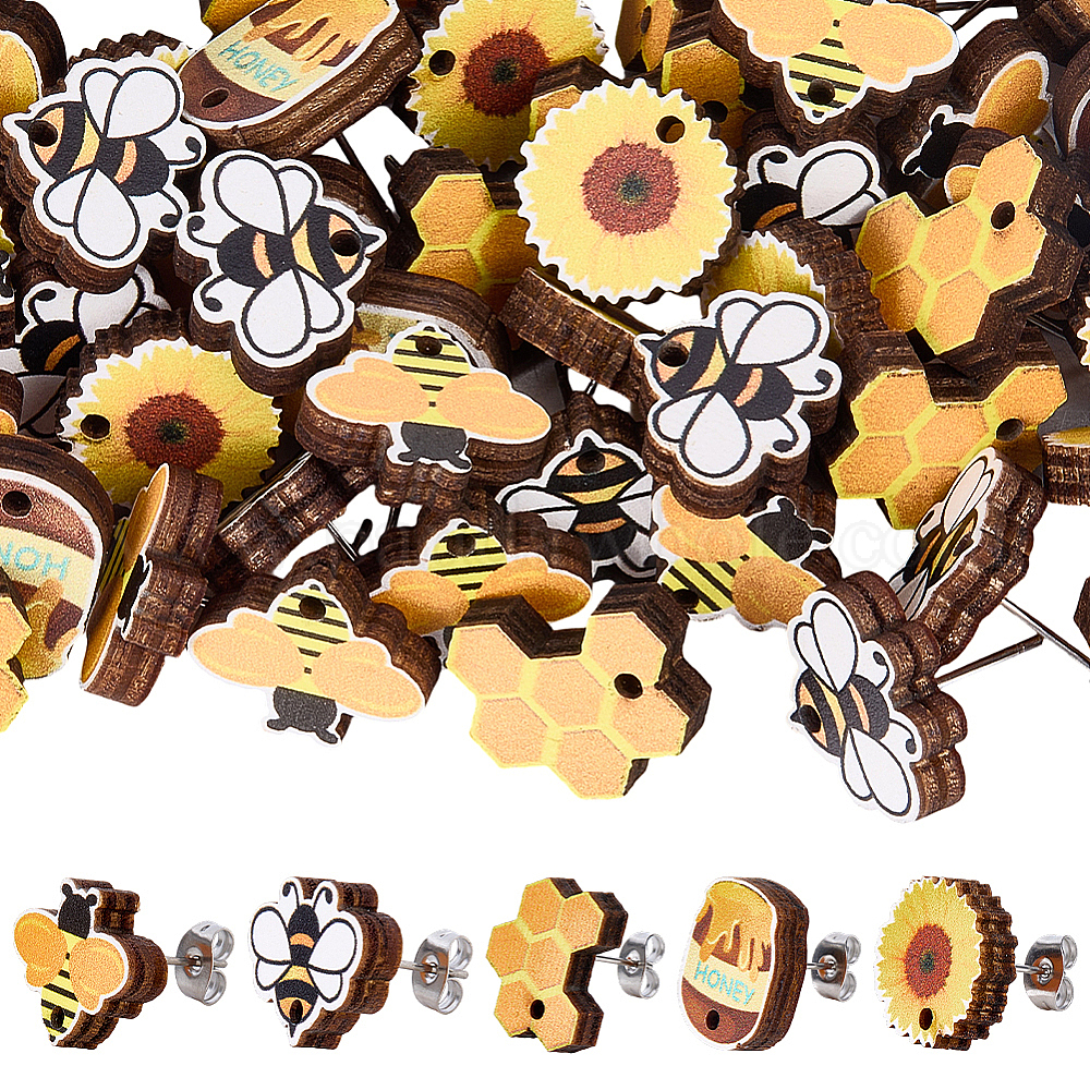 Деревянные серьги-гвоздики в виде пчел: 12~15.5x13~15.5мм, отверстие : 1.6 мм, штифты : 0.7 мм, 5 стили, 12 шт / стиль, 60 шт;