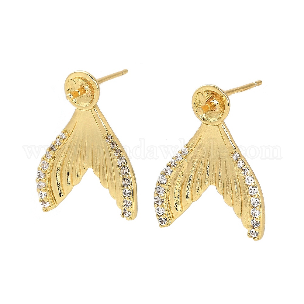 • Настоящее золото 18K Фурнитура для сережек-гвоздиков из латуни с микропаве из прозрачных кубических цирконий в форме рыбьего хвоста, за половину пробурено бисера, реальный 18 k позолоченный, 19.5x16 мм, штифт: 0.7x11 мм / 0.9 мм