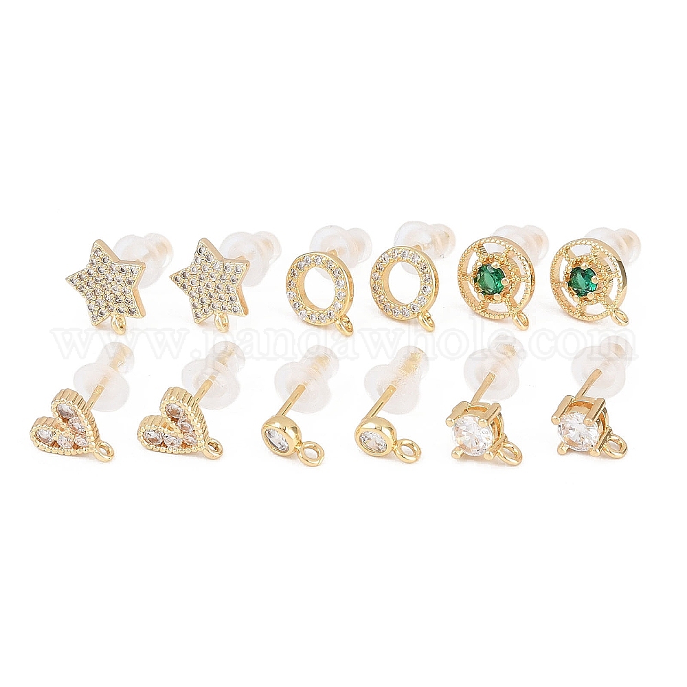 • Звезда Латунные серьги-гвоздики с фианитами, с петлей и 925 булавками из стерлингового серебра, золотые, звезда, 9.5x8.5 мм, отверстие : 0.8 мм, штифты : 0.7 мм