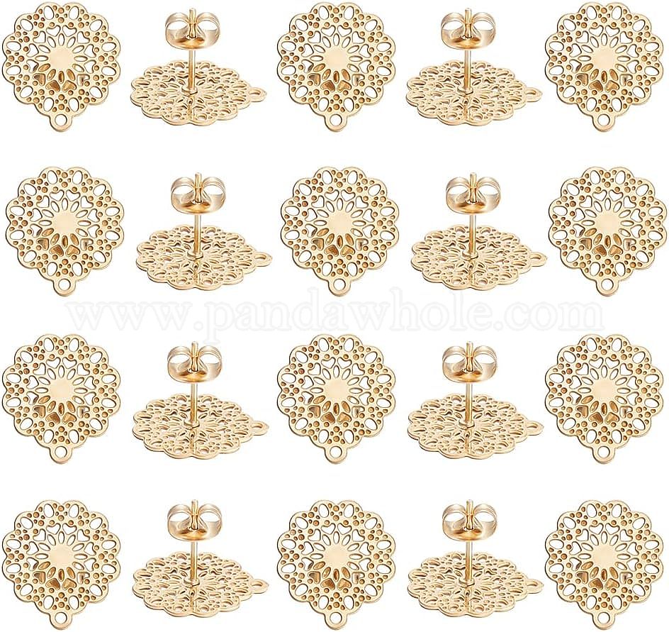 • Золотой 304 Выводы серьги из нержавеющей стали шпилька, с петлей и ушными гайками / серьгами, цветок, золотые, 16x14 мм, отверстие : 1 мм, штифты : 0.7 мм, 20 шт / коробка