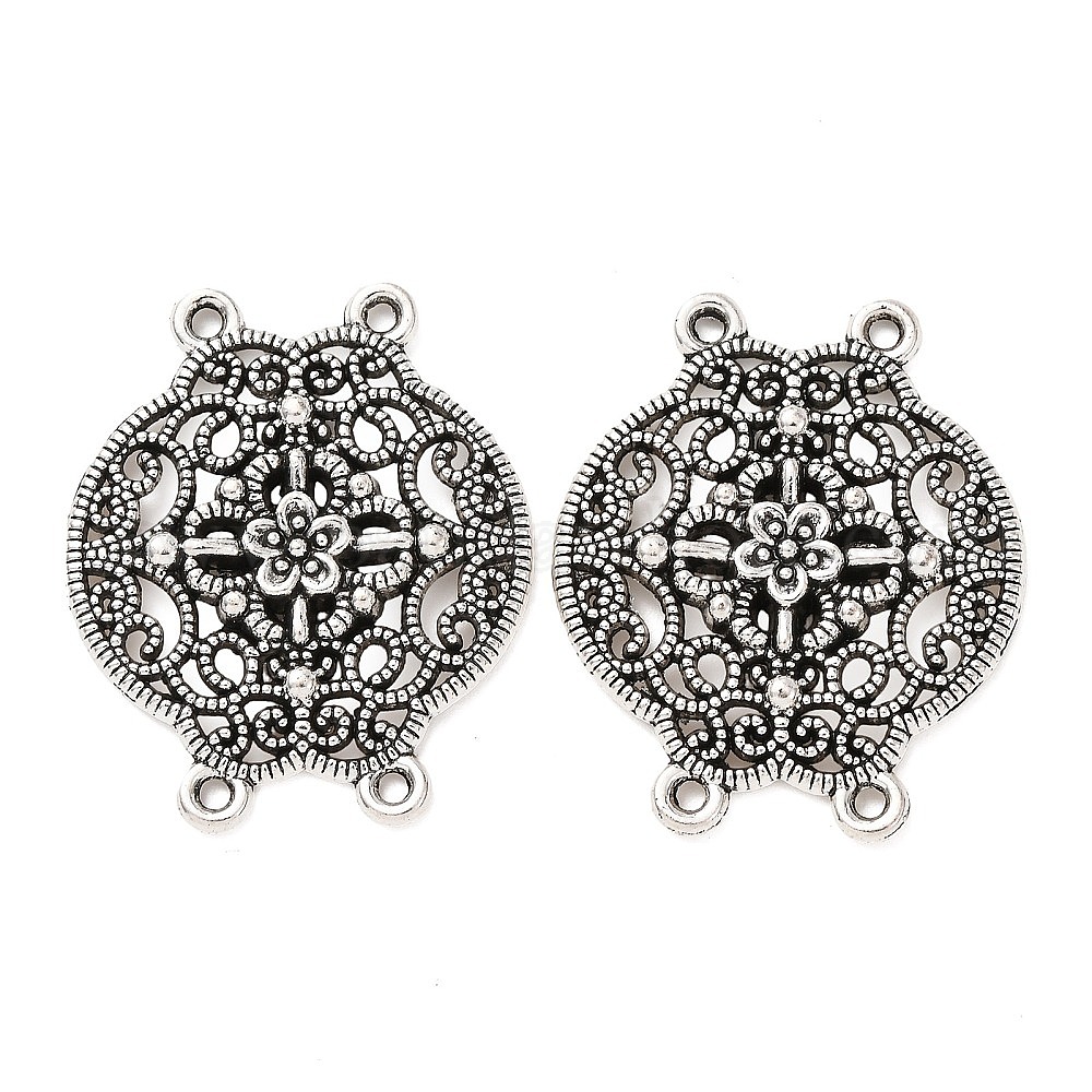 • Античное Серебро Тибетский стиль сплава многожильных ссылки, 4 контур, полые плоские круглые с цветком, античное серебро, 35x29x2 мм, отверстие : 2 мм, Около 145 шт / 1000 г