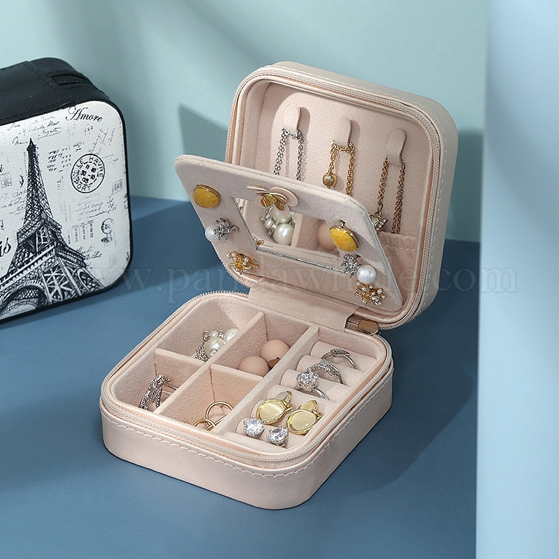 Шкатулка для драгоценностей на молнии из искусственной кожи, дорожный портативный зеркальный футляр для ювелирных изделий, для ожерелья, Кольца, серьги и подвески, квадратный