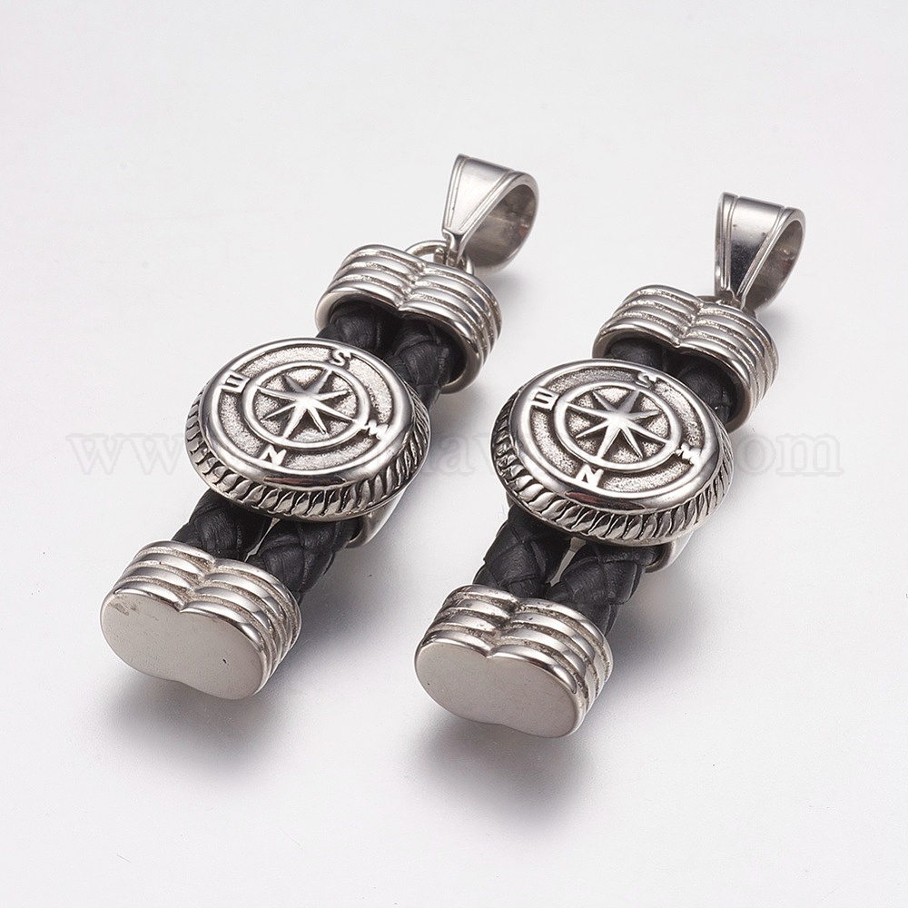 304 из нержавеющей стали большие кулоны, с кожаным шнуром, прямоугольник с компасом, чёрные