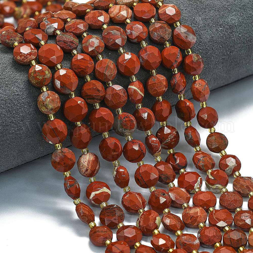 Натуральные красные яшмы бусы пряди, граненый шестиугольный разрез, плоско-круглые, с бисером