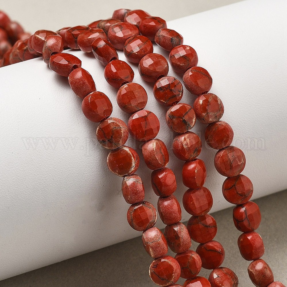 Нити синтетических бусин из красной яшмы, граненый квадратный разрез, плоско-круглые
