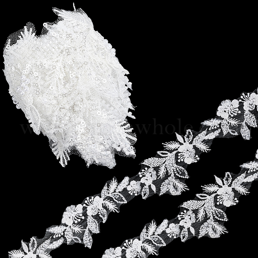 • Белый 2ярды полиэстеровой одежды и аксессуаров, кружевной отделкой, с бисером, жемчугом и стеклянными бусинами, белые, 32~90x0.1~4 мм
