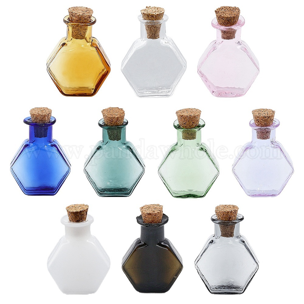 шестигранный кукольный домик, миниатюрные стеклянные пробковые бутылки, украшение: около 3 см в длину, Бутылка: 25x20.5x8.5 мм, 10 цветов, 1 шт / цвет, 10 шт.
