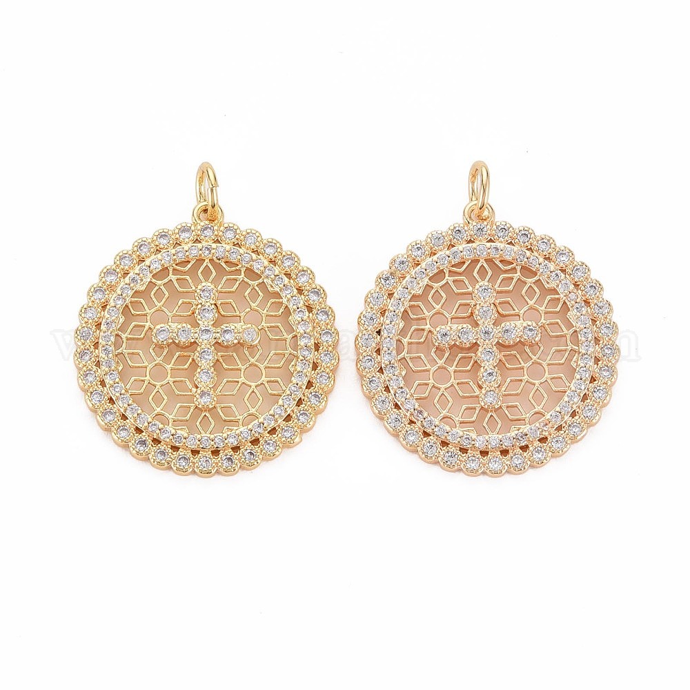 Латунные микропаве прозрачные подвески с фианитом, без никеля , плоские круглые с крестом