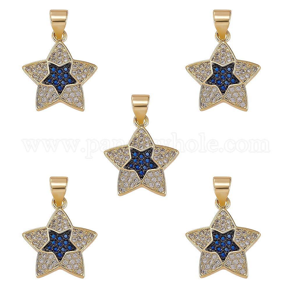 • Средно-синий Латунные микро проложить кубического циркония подвески, реальный 18 k позолоченный, звезда, светло-синий, 17x15x3 мм, отверстие : 4x3 мм, 5 шт / коробка