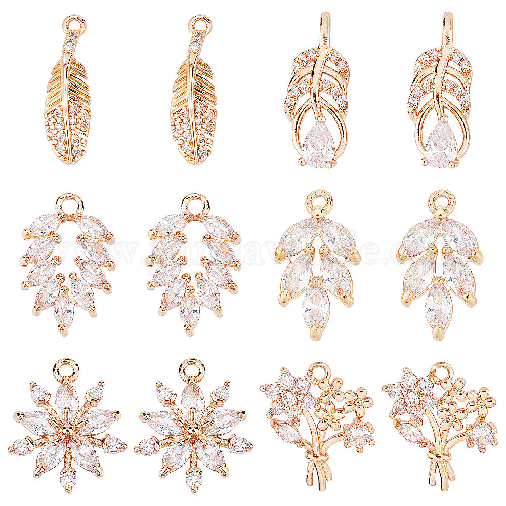 12 шт. 6 кулоны из латуни с микропаве и кубическим цирконием, долговечный, золотой свет, лист и цветок и перо