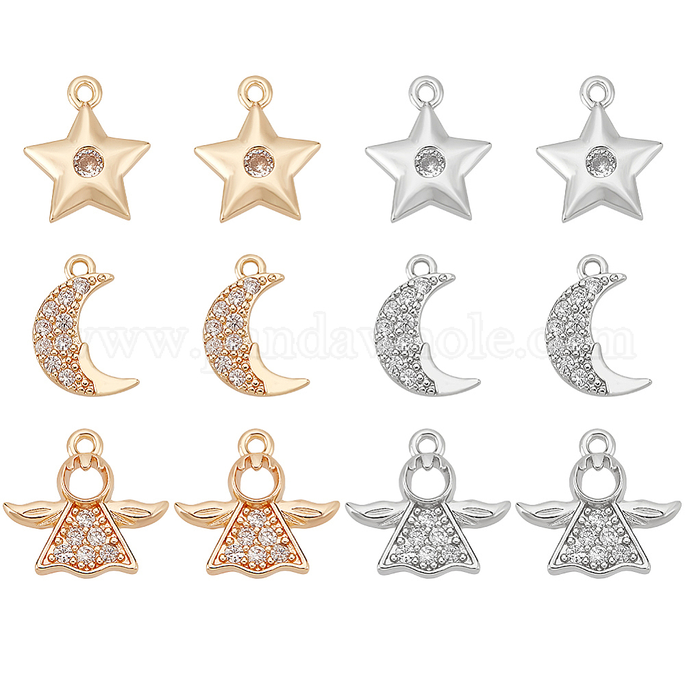 12 шт. 6 стиль стойка покрытие латунь микро паве прозрачные кубические цирконии подвески, долговечный, без кадмия и без свинца, луна и звезда и ангел