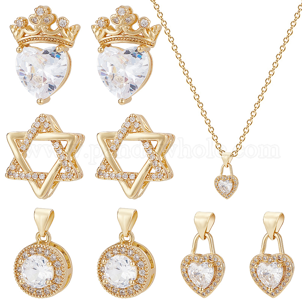 8 шт. 4 кулоны из латуни с микропаве и кубическим цирконием, без кадмия и без свинца, долговечный, прозрачные, сердце с короной и звездой давида и плоской круглой (02FPRC)