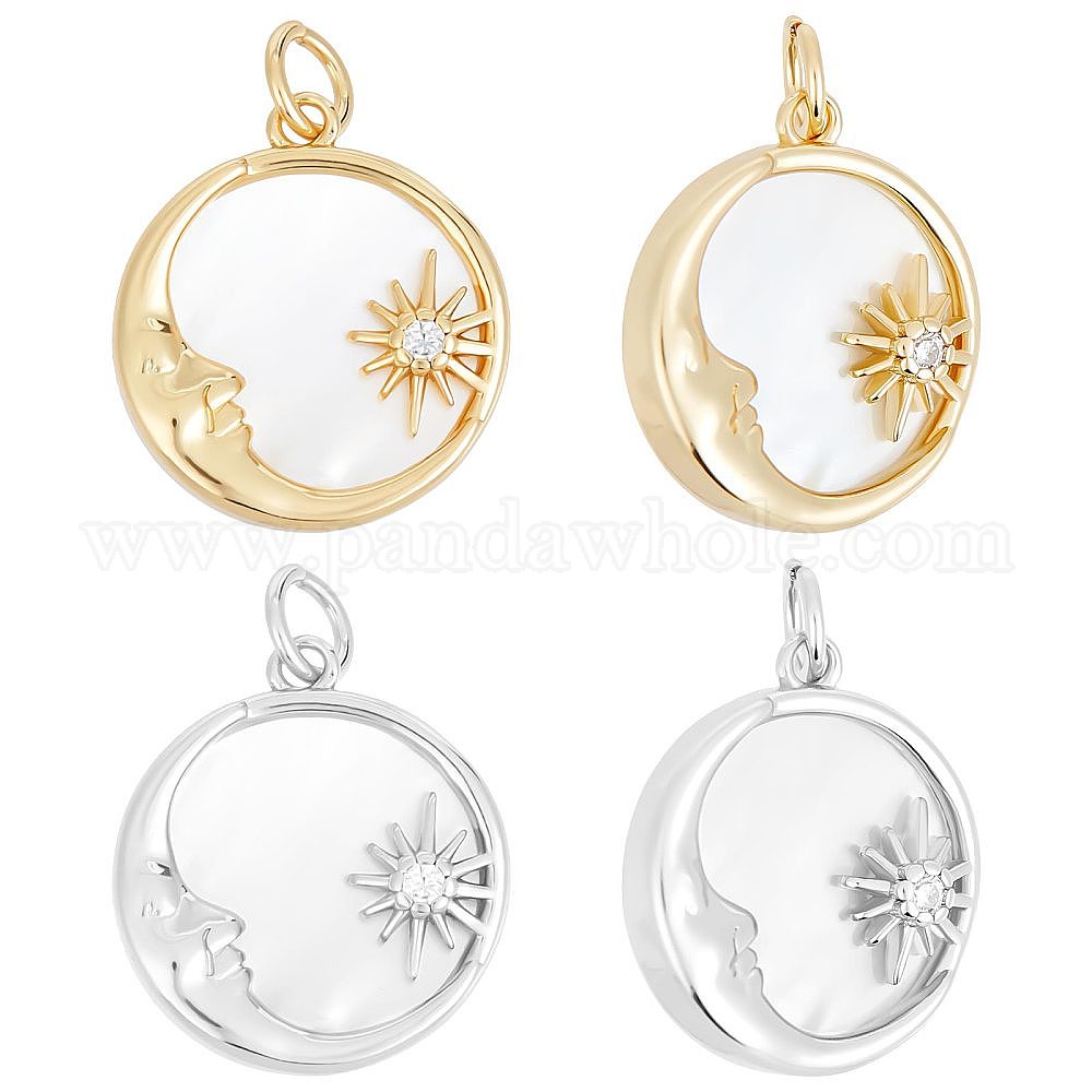 4 шт. 2 цвета латунные подвески из прозрачного кубического циркония с микропаве, с ракушкой и прыжковым кольцом, долговечный, плоский круг с луной и солнцем