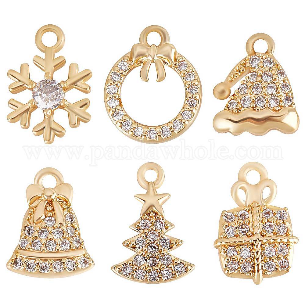 12 шт 6 стиль латунные микропаве подвески из фианита, без никеля , на Рождество, снежинка/елка/колокольчик, реальный 18 k позолоченный