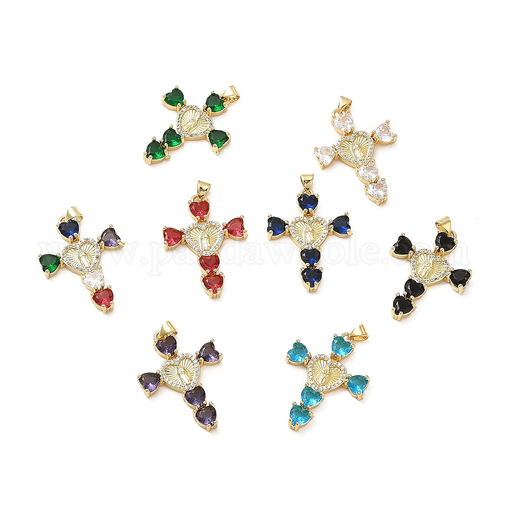 Стойки обшивки латунные подвески, со стеклянным фианитом, религия сердце крест с оберегом девы марии, без кадмия и без свинца, долговечный, реальный 18 k позолоченный