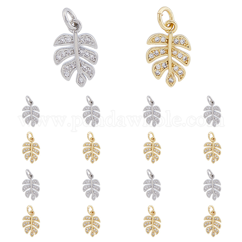 16 шт. 2 цвета латунь микропаве прозрачные подвески из кубического циркония, очарование листьев монстеры, с открытыми кольцами прыжковых