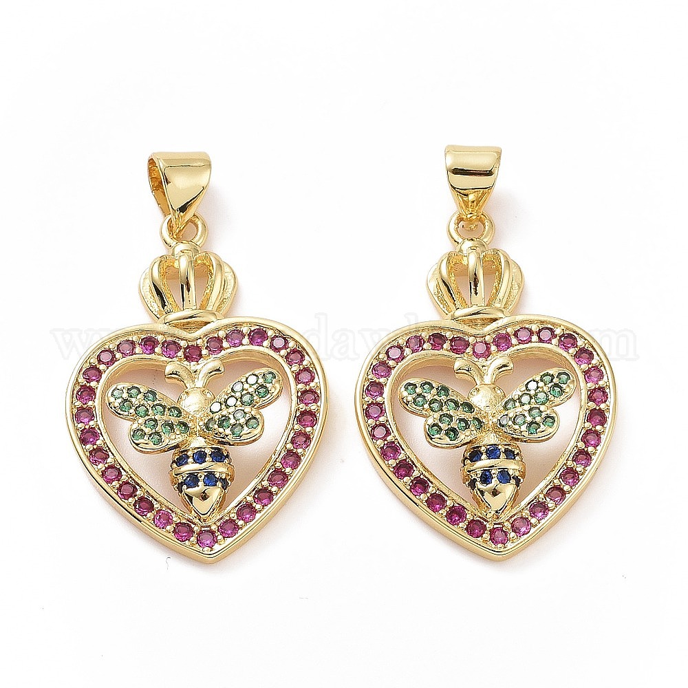 • Золотой Латуни циркония кубической подвески, без кадмия и без свинца, подвески в виде сердца с пчелами, золотые, 27x18x6 мм, отверстие : 3x5 мм