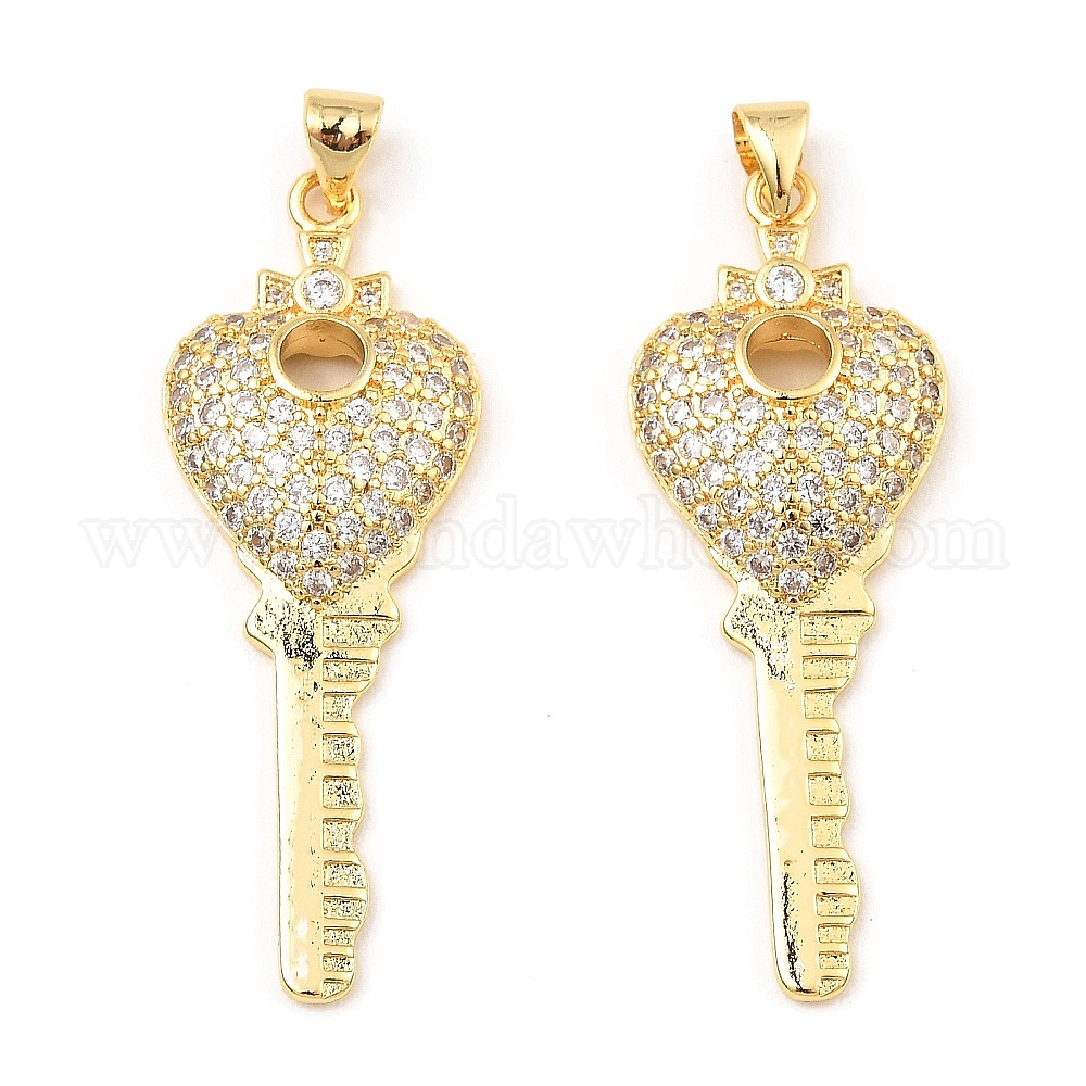 • Настоящее золото 16K Покрытие стойки латунь микропаве прозрачные подвески из кубического циркония, без кадмия и без свинца, Ключ с сердцем, реальный 16 k позолоченный, 42x15.5x5 мм, отверстие : 3.5x4 мм