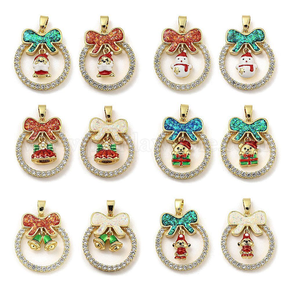 Рождественские латунные подвески с микропаве из фианита, без кадмия и без свинца, с эмалью и синтетическим опалом, Рождественский венок
