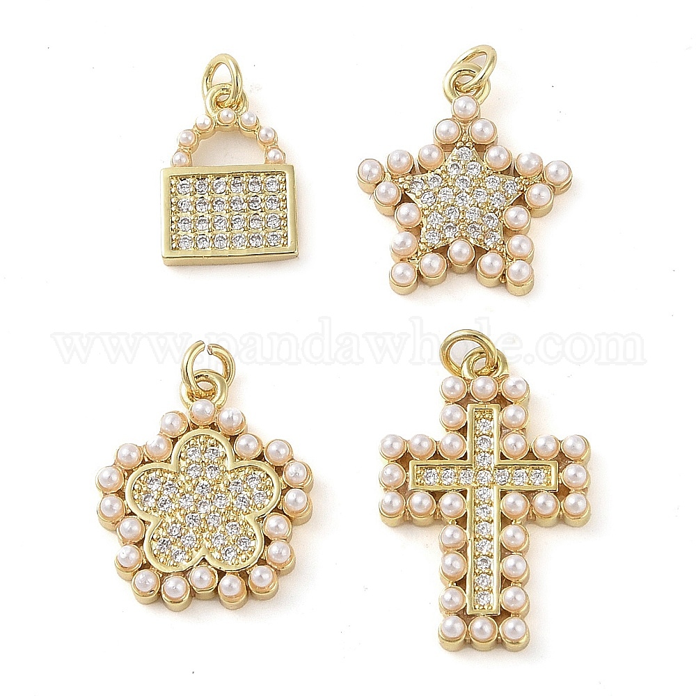 • Звезда Латунные микропаве прозрачные подвески с фианитом, без кадмия и без свинца, с ABS имитации жемчуга, реальный 18 k позолоченный, звезда, 16.5x15x2.5 мм, отверстие : 1.6 мм