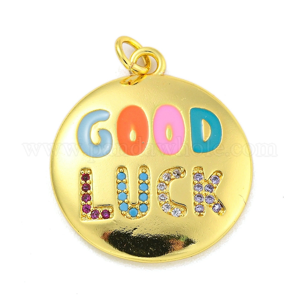 • Разноцветный Настоящие 18 k позолоченные латунные подвески с микропаве и кубическим цирконием, без кадмия, без никеля и без свинца, с эмалью и кольцами для прыжков, плоский круглый со словом удачи, красочный, 25x22x3 мм, отверстие : 3 мм