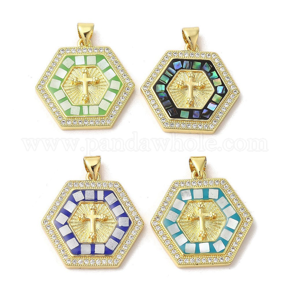 Подвески из латуни с микропаве и крестом из кубического циркония, с эмалью и ракушкой, долговечный, без свинца и без кадмия, реальный 18 k позолоченный, шестиугольник