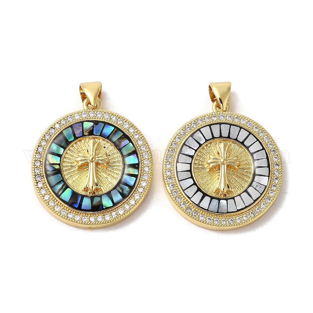Латунные микропаве прозрачные подвески с фианитом, с эмалью и ракушкой, долговечный, без свинца и без кадмия, реальный 18 k позолоченный, плоские круглые с крестом
