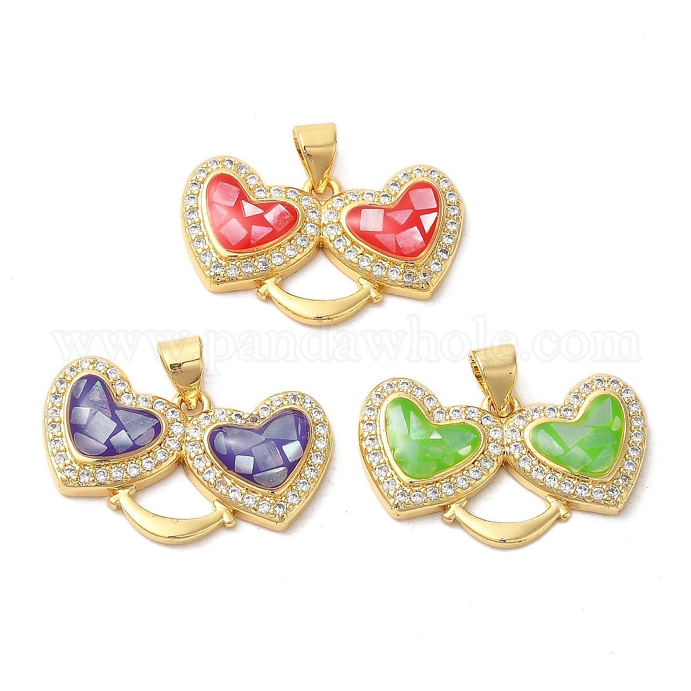 Подвески с двойным сердцем из латуни с микропаве и кубическим цирконием, с эмалью и ракушкой, долговечный, без свинца и без кадмия, реальный 18 k позолоченный